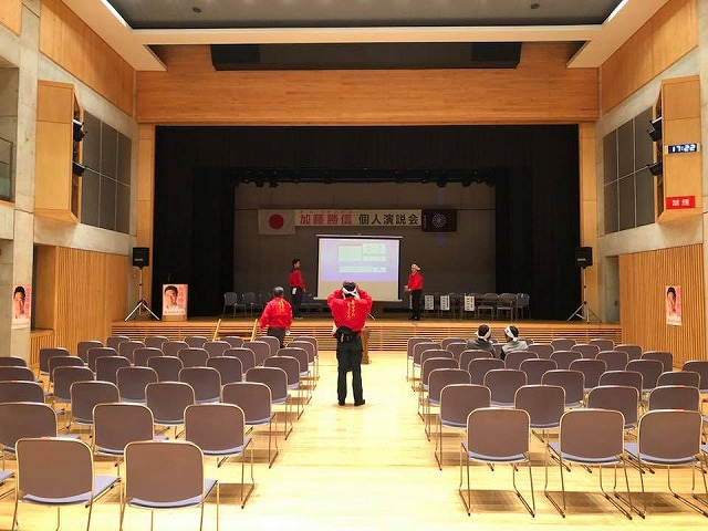 それから加藤勝信新見選挙事務所。4時30分から「おおさ総合センター」で、『加藤勝信個人演説会』の準備。