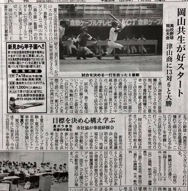 「サッカーW杯」でフランス共和国が頂点に立った朝の新聞で、新見市の岡山共生が初戦突破した記事を一番に読む。夏の高校野球岡山県大会は、備北民報と山陽新聞です。