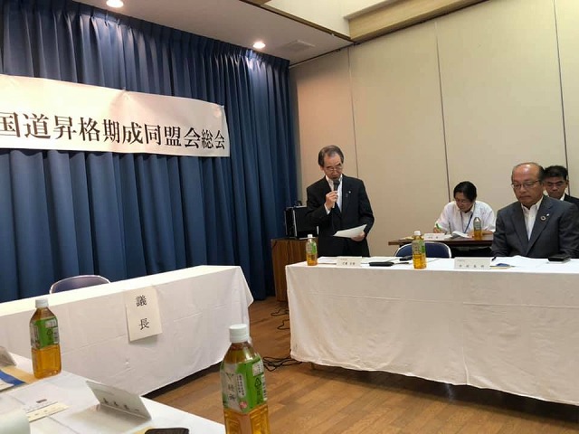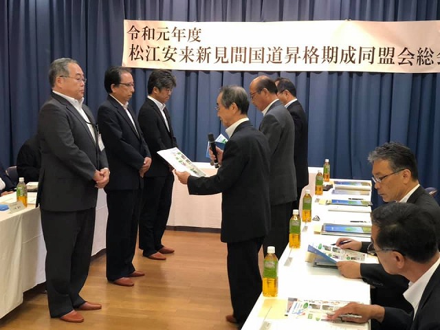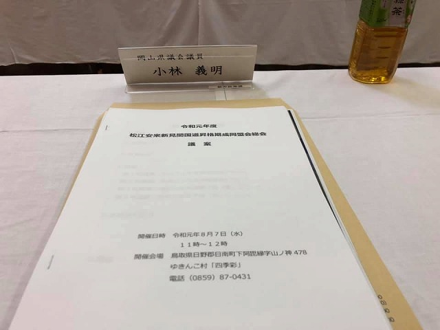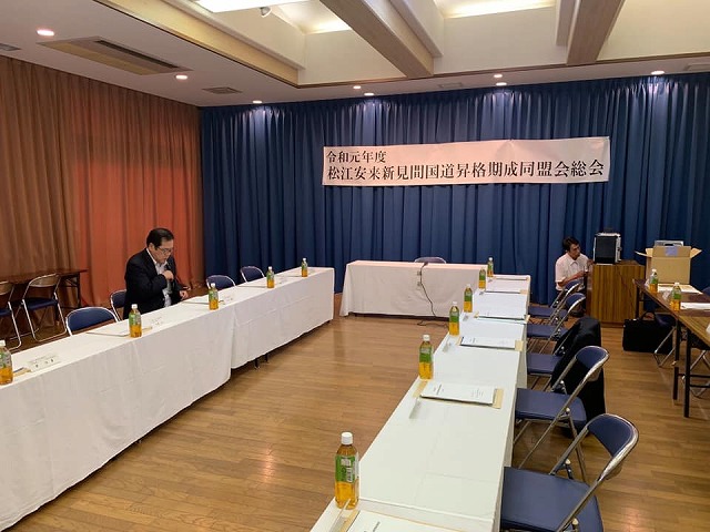 11時から、鳥取県日野郡日南町の「ゆきんこ村・四季彩」で開催された『令和元年度松江安来新見間国道昇格期成同盟(会長・近藤宏樹安来市長)総会』に、顧問として出席しました。おめでとうございました。総会の後、「要望書」が島根県松江県土整備事務所、鳥取県西部総合事務所、岡山県備中県民局地域建設部に提出されました。