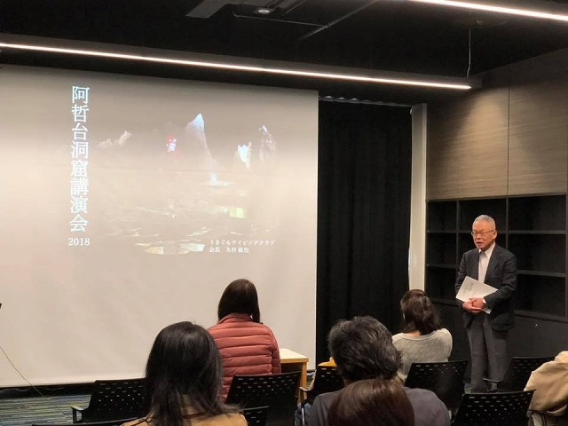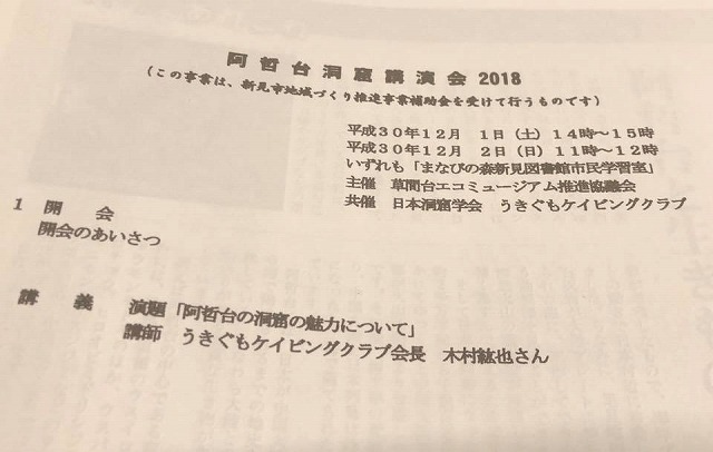 11時から、「まなびの森図書館市民学習室」で開催された『阿哲台洞窟講演会2018』に出席しました。ご案内ありがとうございました。うきぐもケイビングクラブの木村紘也会長が、「阿哲台の洞窟の魅力について」と題して講演されました。楽しかったですよ。