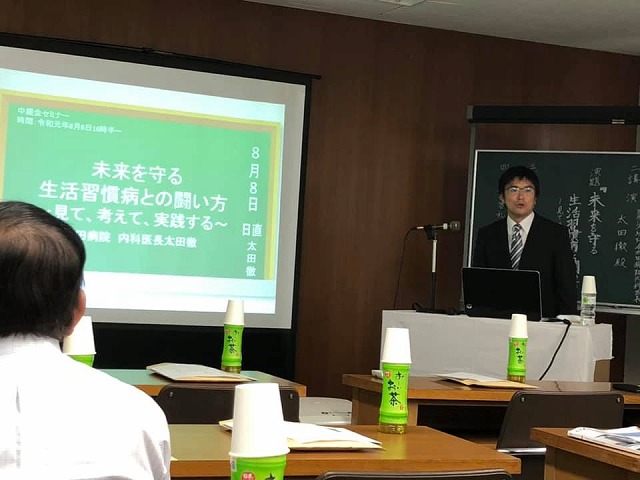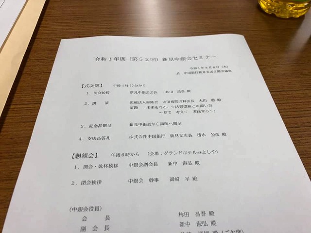 16時30分から、「中国銀行新見支店」で開催された『令和元年度(第52回)新見中銀会セミナー』に出席しました。本日の講師は、太田病院内科医長太田徹先生。テーマは「未来を守る、生活習慣病との闘い方~見て 考えて 実践する~」でした。18時から会場を移して『意見交換会』。