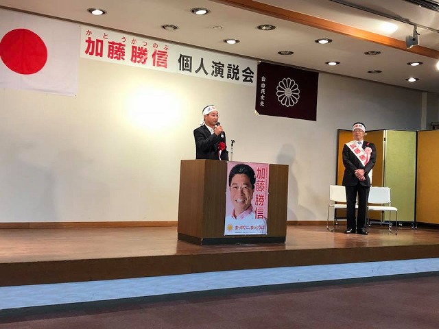 19時から「新見商工会議所会館」で開催された『加藤勝信個人演説会』に出席しました。加藤勝信候補をお支え頂く多くの皆様がご出席下さいました。ありがとうございます。朝起きて加藤!昼はマイクで加藤!夜も加藤!加藤!さあ、頑張りましょう。