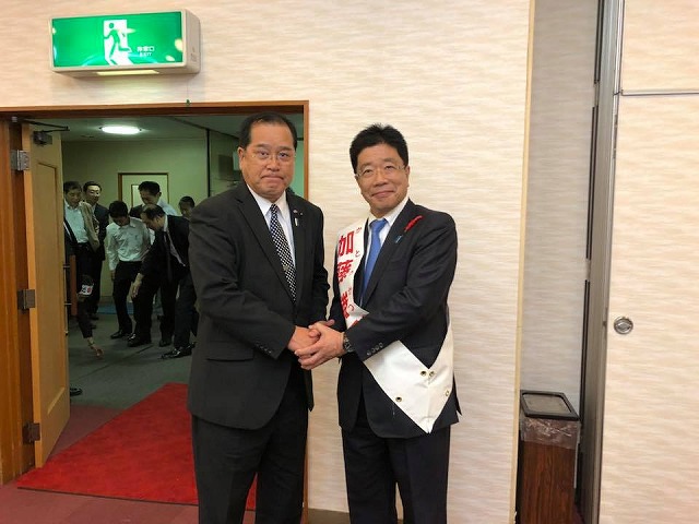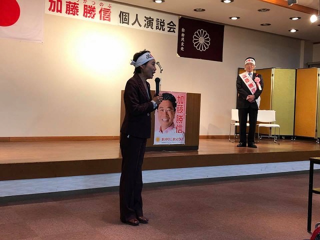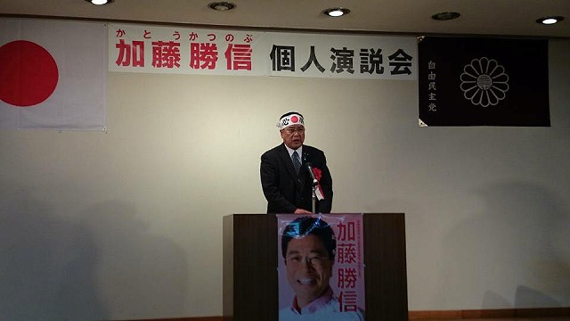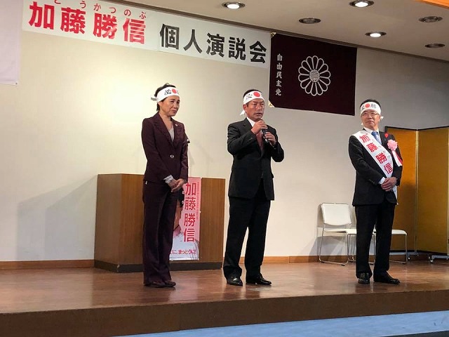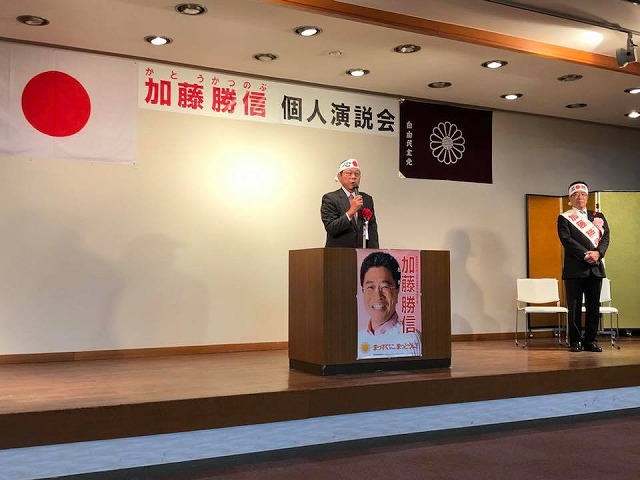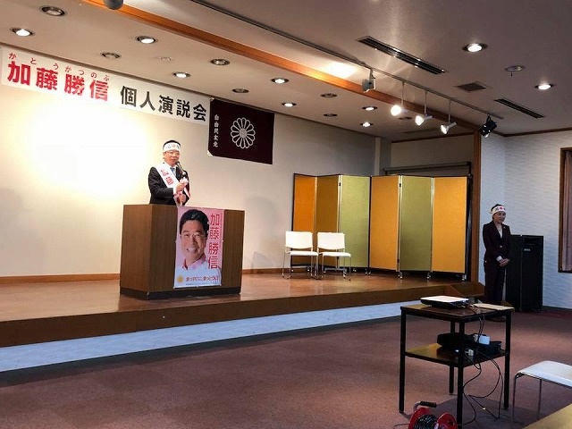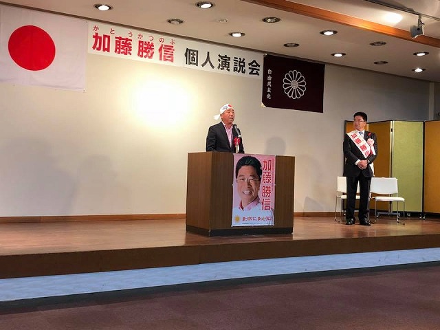 19時から「新見商工会議所会館」で開催された『加藤勝信個人演説会』に出席しました。加藤勝信候補をお支え頂く多くの皆様がご出席下さいました。ありがとうございます。朝起きて加藤!昼はマイクで加藤!夜も加藤!加藤!さあ、頑張りましょう。