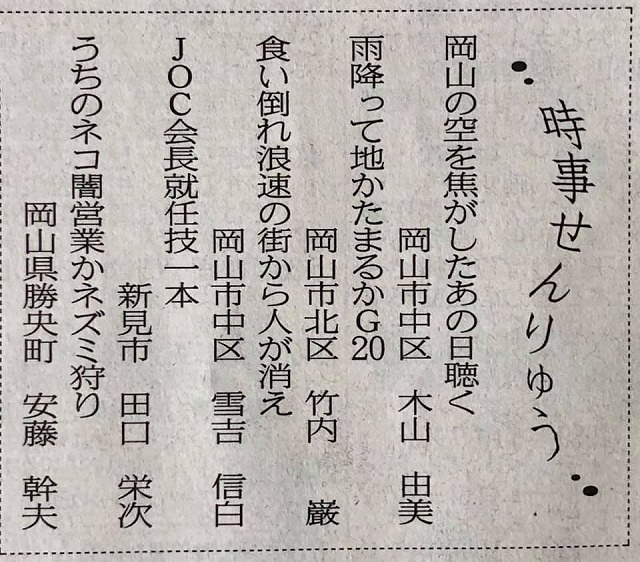 同級生田口栄次くん、136回目の「山陽時事せんりゅう」です。おめでとうございます。