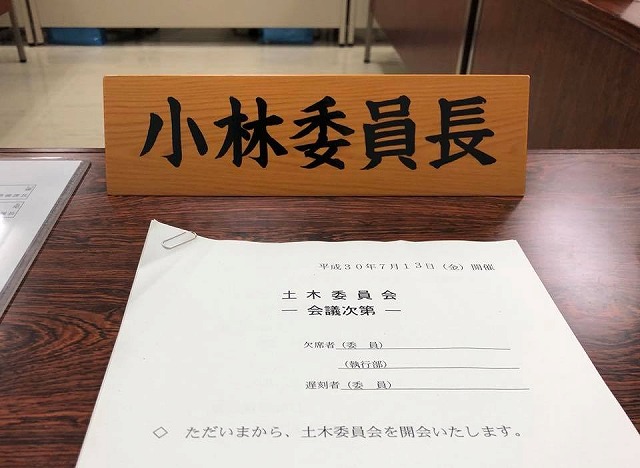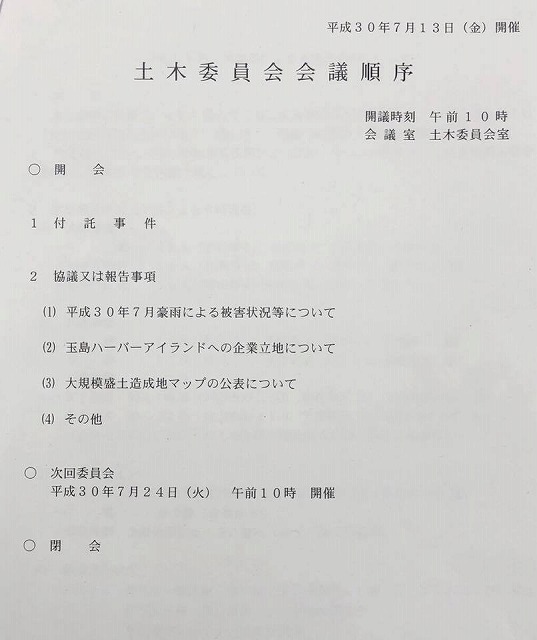 10時から「土木委員会」開会。委員長として一言ご挨拶を申し上げました。続いて、協議又は報告事件に入り、初めに県下の豪雨被害状況等について報告がありました。深刻です。