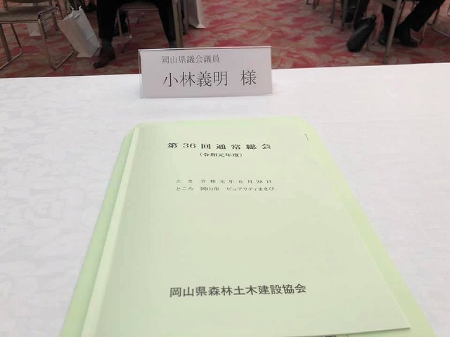 13時から、「ピュアリティまきび」で開催された『岡山県森林土木建設協会令和元年度第36回通常総会』に、県議会農林水産委員長として出席し、ご祝辞を申し上げました。おめでとうございました。