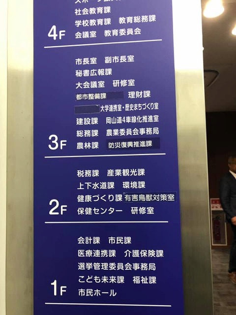 高梁市での期成会終了後、上田県議と共に高梁市役所を訪問し、宮田公人副議長と意見交換をしました。ありがとうございました。おっ!理財課、岡山道4車線化推進室、有害鳥獣対策室。エレベーターの案内表示が目に入った。