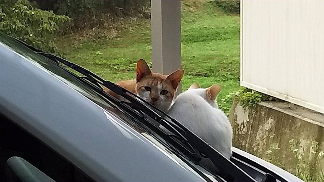 逃げようともしないノラ猫くんです。車に登らないでよね。