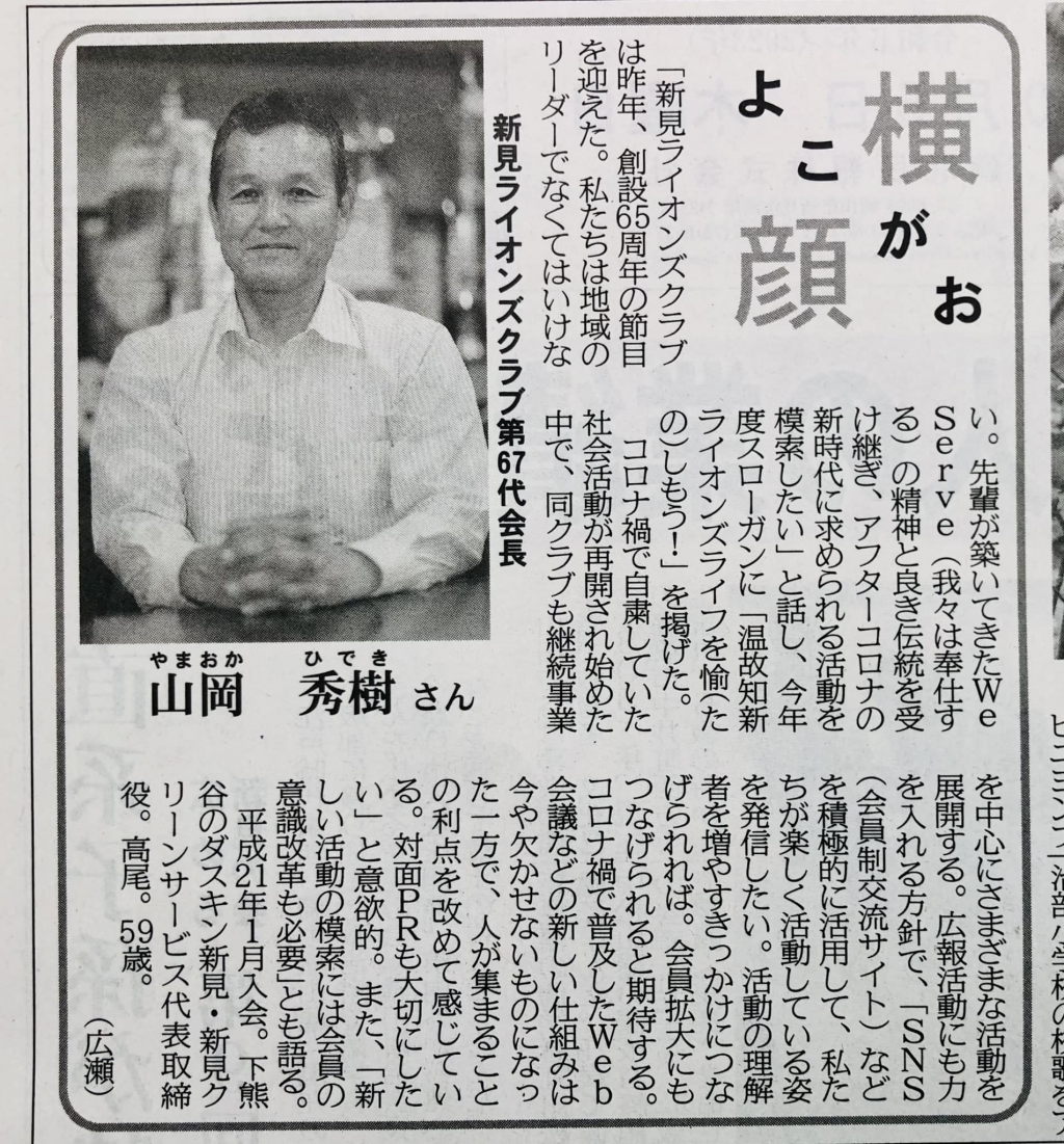 山岡会長、よろしくお願いします。正面むいても「横顔」欄~♬地域紙「備北民報」です。