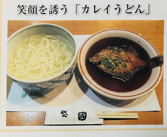 写真は、名鉄瀬戸線「尾張瀬戸駅」駅前ロータリーに面する「和処・國」の名物「カレイうどん」である。