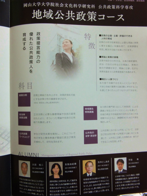 岡山大学大学院社会文化科学研究科で、来年度の学生の募集をしています。私も現在在籍しておりますが、行政関係の若い皆様、政治に携わっている皆様、しっかりとした基礎知識を得ることが出来ます。おすすめします。地域の為に。