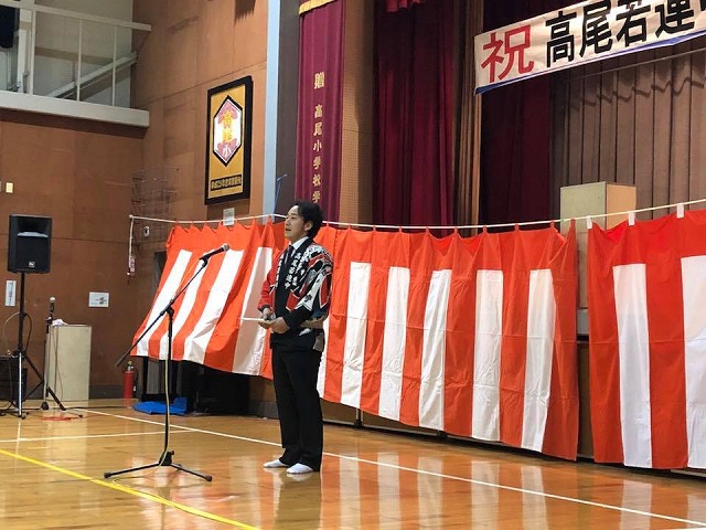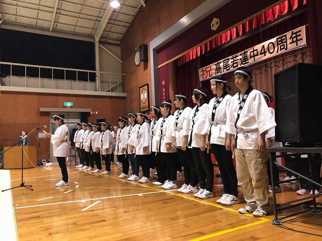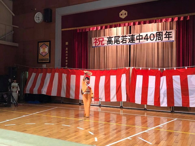 17時から「高尾小学校体育館」で開催された『高尾若連中40周年記念行事』に出席しました。初めに、加藤勝信厚生労働大臣令夫人他の来賓が出席して記念式典が開催され、冒頭第40代の仲田寛頭取が、歴代頭取や地域の皆様への感謝と決意表明をされました。益々のご活躍を期待します。おめでとうございました。なお、一言ご挨拶の機会を頂き、ありがとうございました。
