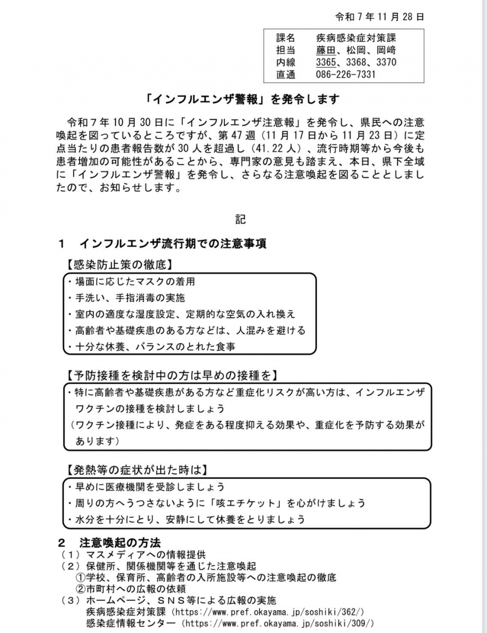 岡山県では11月28日、「インフルエンザ警報」が発令されています。十分ご注意願います。