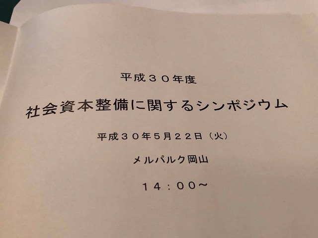 14時から、岡山市内のホテルで開催された『平成30年度社会資本整備に関するシンポジュウム』に出席しました。「岡山事業所の事業」について、国土交通省岡山国道事務所の松野所長が講演。続いて「吉井川・旭川における河川事業』について、国土交通省岡山河川事務所の三戸所長が講演され、最期に岡山県土木部河川課の安倉課長が講演されました。安倉課長、お疲れ様でした。