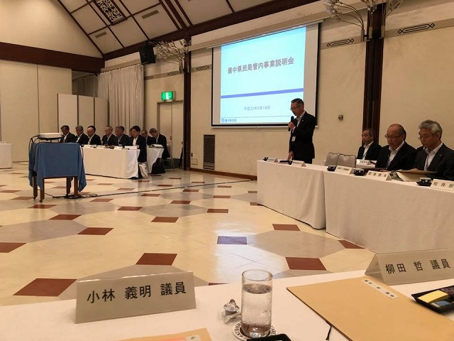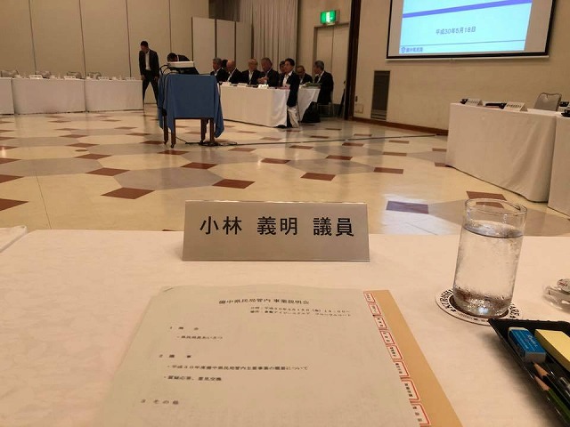 16時から、「倉敷アイビースクエアフローラルコート」で開催された『備中県民局管内事業説明会』に出席しました。「平成30年度備中県民局管内主要事業の概要」について、説明を受けました。その後、意見交換懇親会。
