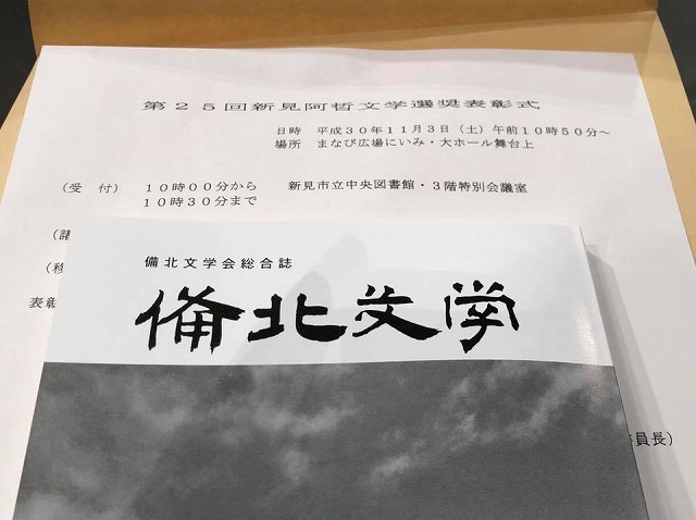 10時50分から、「まなび広場にいみ」で開催された『第25回新見阿哲文学選奨表彰式』に出席して、一言お祝いのご挨拶をさせて頂きました。入賞された皆様、おめでとうございました。