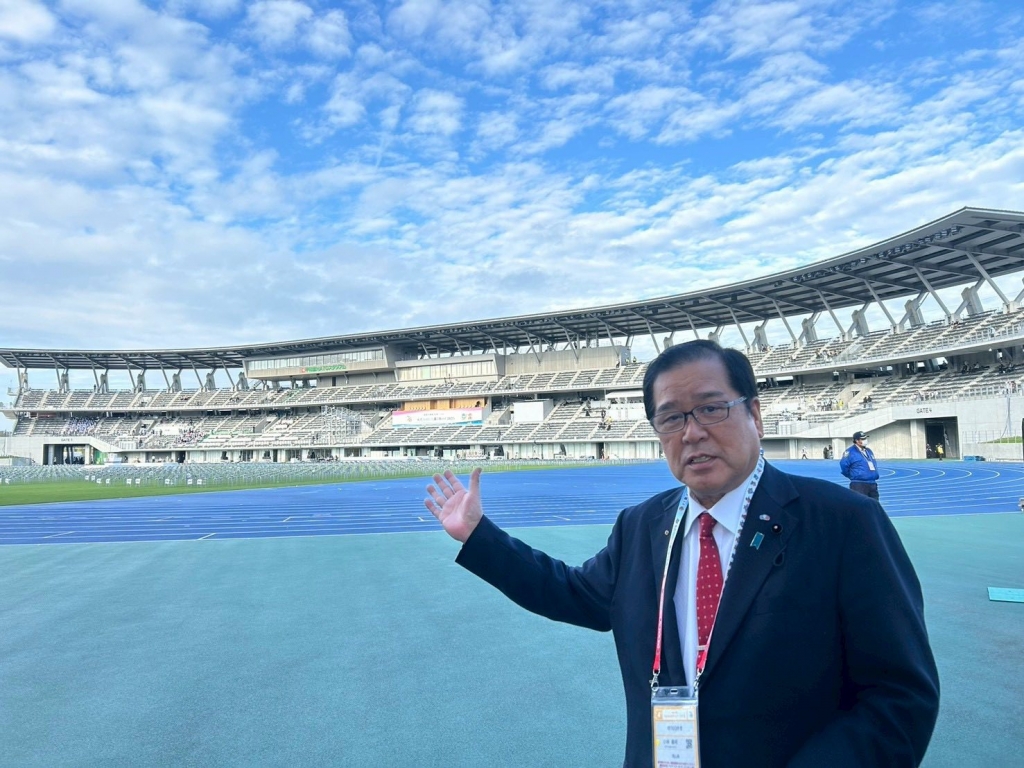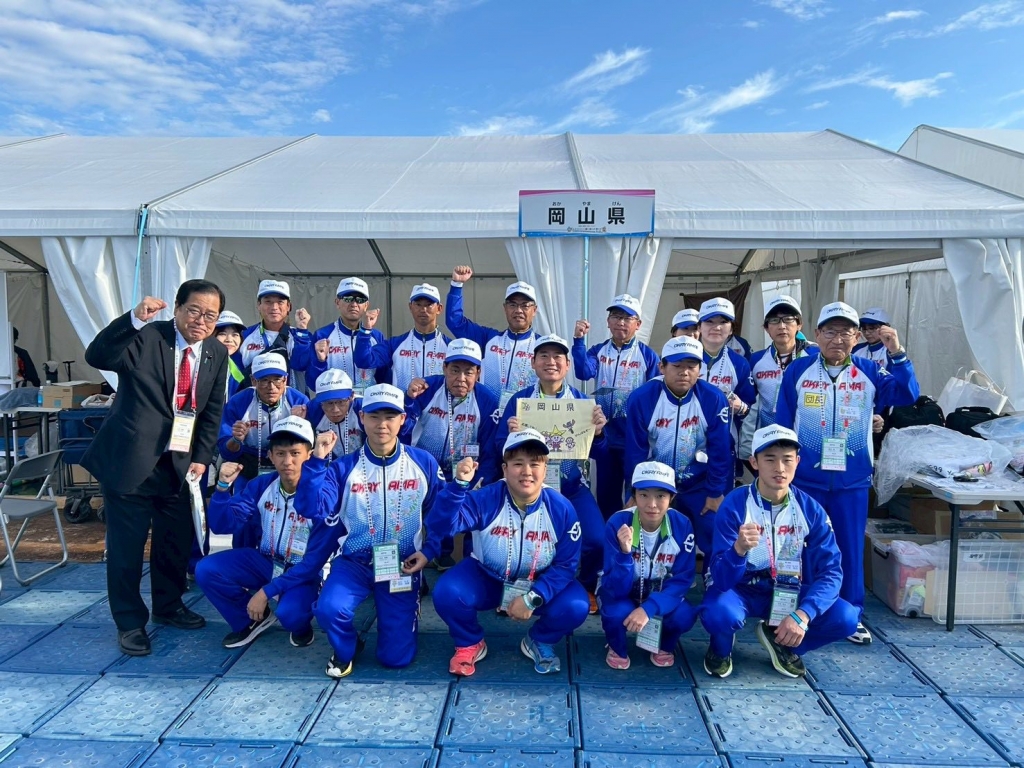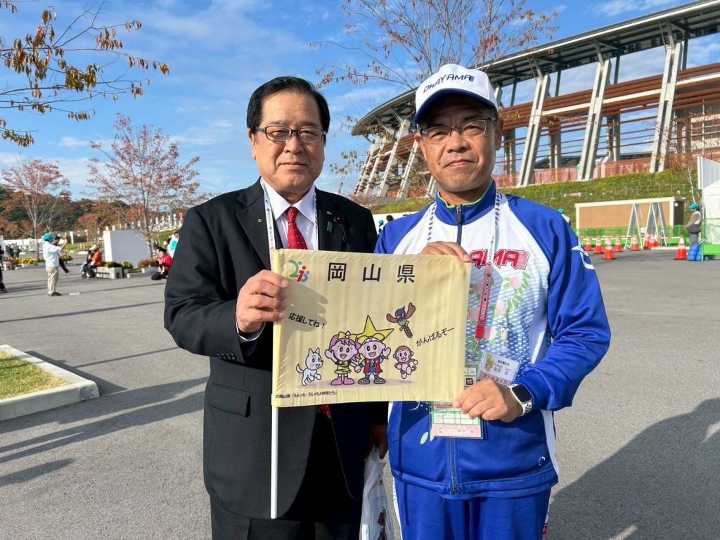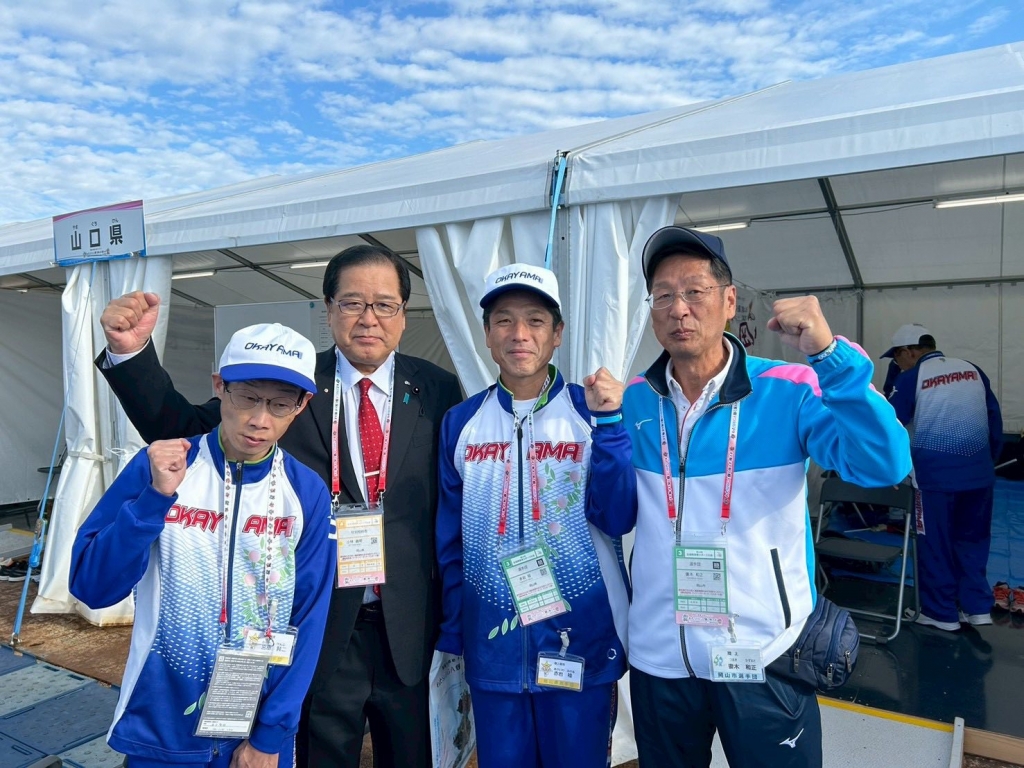 『第24回全国障がい者スポーツ大会』の会場に入りました。岡山県選手団、岡山市選手団の控えテントを訪問、激励させて頂きました。新見市のコーチ、選手の皆さんともお会いすることが出来ました。頑張って!