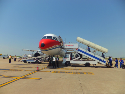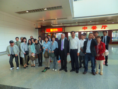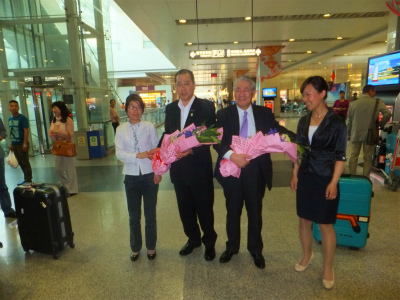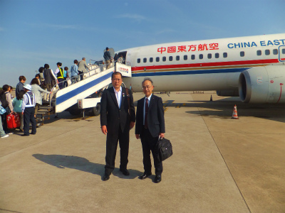 武漢空港で、「信陽市シ河区」の出迎えを受ける。田口訪問団と共に。