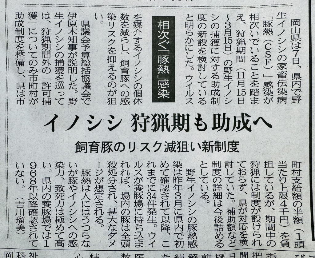 昨日の県議会「予算総括協議会」、自民党代表質問でとりあげたイノシシ捕獲の通年補助の課題。町村会の強い要望も頂いていた。良かった。記事は山陽新聞です。