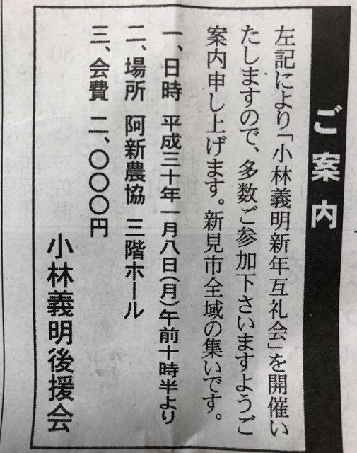 後援会の皆様のお陰で、「小林義明後援会「明友会」新年互礼会」を開催してい頂くこととなりました。多くの皆様とお話しが出来たら嬉しく思います。よろしくお願いします。