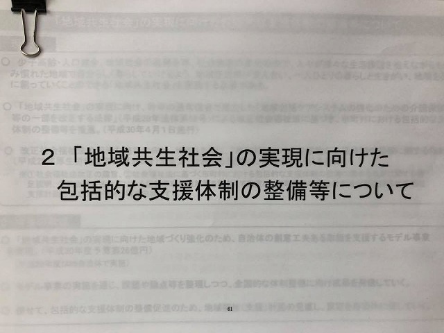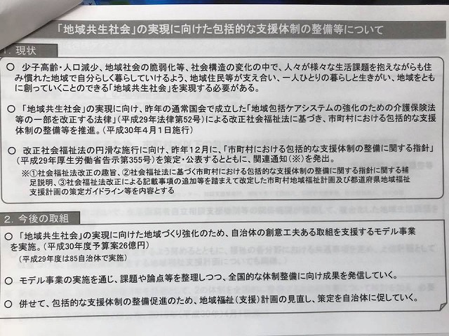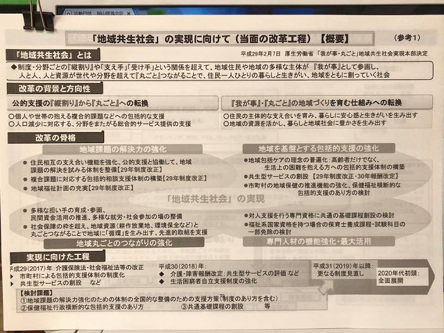 「住民が主体的に地域課題を把握して解決を試みる体制づくり」、「人々が様々な生活課題を抱えながらも住み慣れた地域で自分らしく暮らしていけるよう、地域住民等が支え合い、一人ひとりの暮らしと生きがい、地域を共に創っていくことのできる地域共生社会の実現」等々の言葉が並んでいる。
