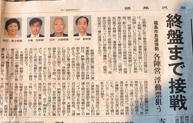 寒くなりました。東北は福島ともなれば、なおさらです。遠く山並みは白くなっております。地元紙は、厳しい福島市長選挙の様子を伝えています。