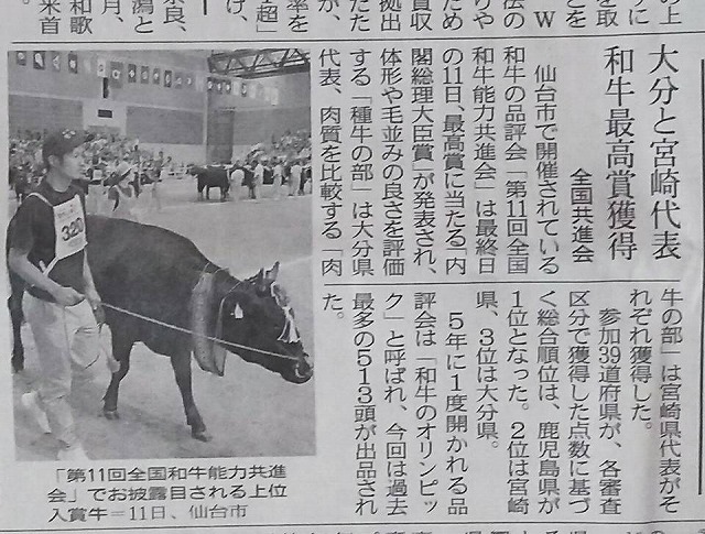 『第11回全国和牛能力共進会宮城大会』の結果が、小さく報じられている。山陽新聞です。