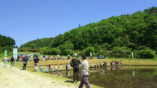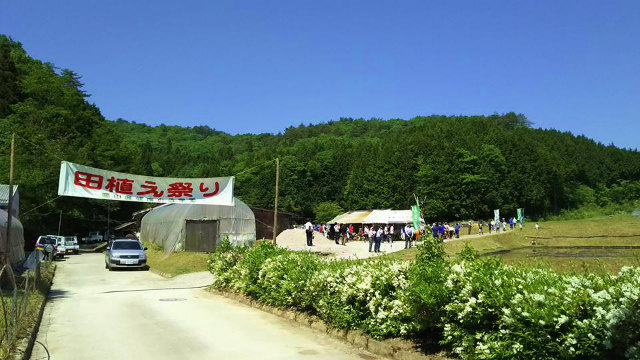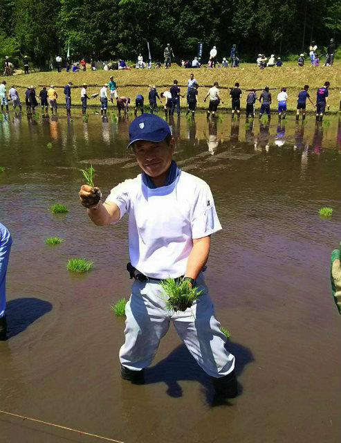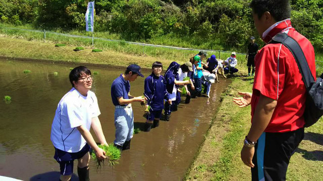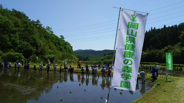 続いて、岡山県健康の森学園の『田植え祭り』に参加しました。本郷小学校や岡山共生高校の児童・生徒も応援参加していました。