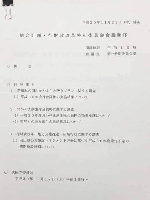 10時から「総合計画・行財政改革特別委員会」に出席しました。12時から「政友会」に出席しました。
