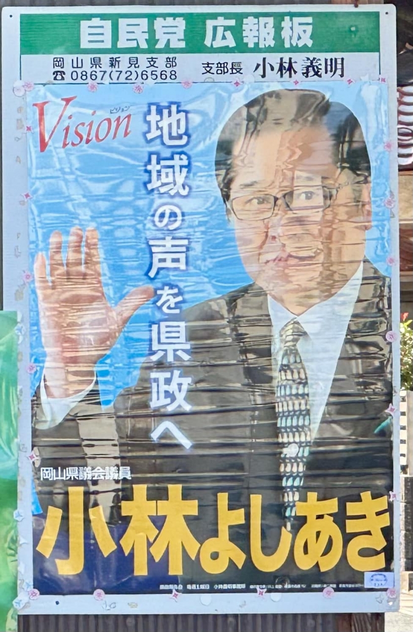 新見へ帰って、18時から開催される「新見中銀会」まで、少し時間が空いたので、ポスター貼りを行いました。(汗!)ポスターも溶けそうでした。