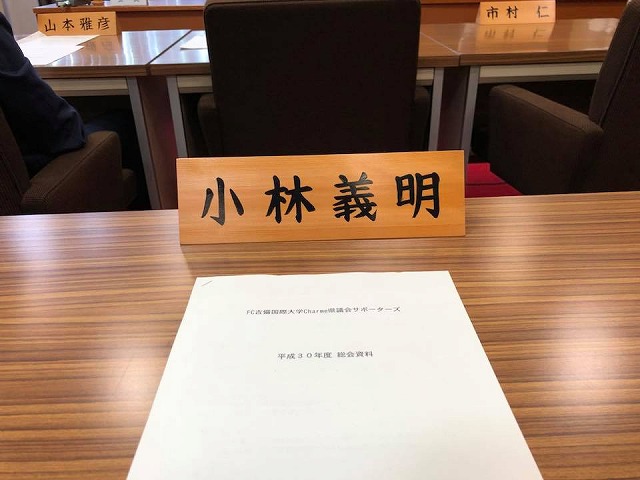 続いて、『FC吉備国際大学シャルムサポーターズ総会』に出席しました。総会の後、東監督からシャルムの現状と抱負についてお話しいただきました。