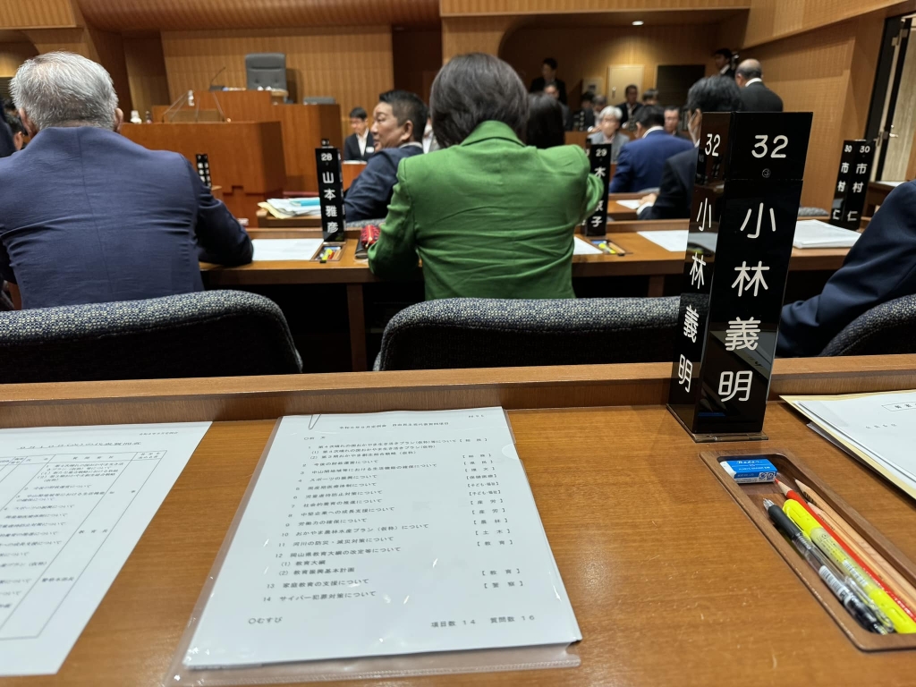 10時から、「9月定例岡山県議会」再開。自民、民主、公明の3党による代表質問でした。