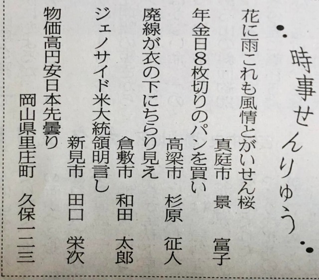 同級生の田口栄次くん、169回目の山陽新聞「時事せんりゅう」です。凄いね。