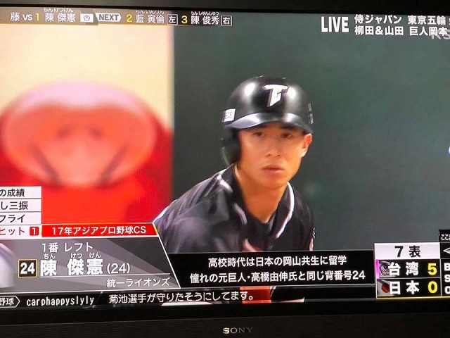 TVで「日本VS台湾」を観戦。台湾代表チームの一番バッター、背番号24の陳選手は、岡山県共生高校野球部OBです。ちょっと誇らしい気分。
