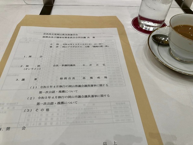 13時から、岡山市内のホテルで開催された「自由民主党岡山県支部連合会総務会及び選挙対策委員会合同会議」に出席しました。