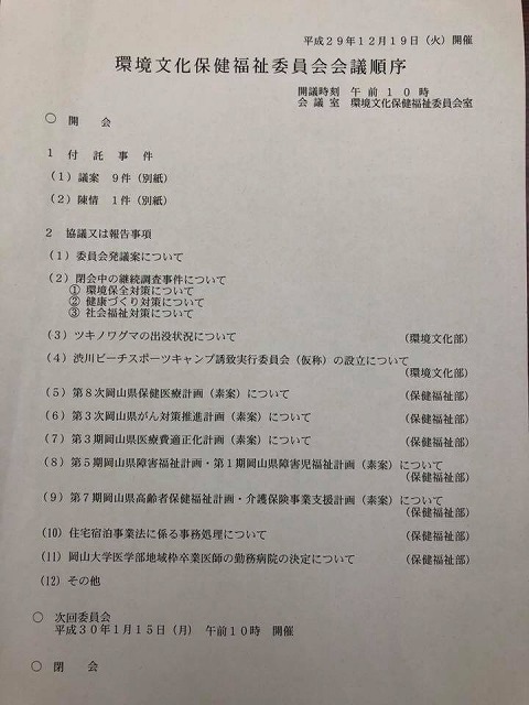 10時から『環境文化保健福祉委員会」を開会しました。12時30分頃閉会しました。今日の様子は写真で。