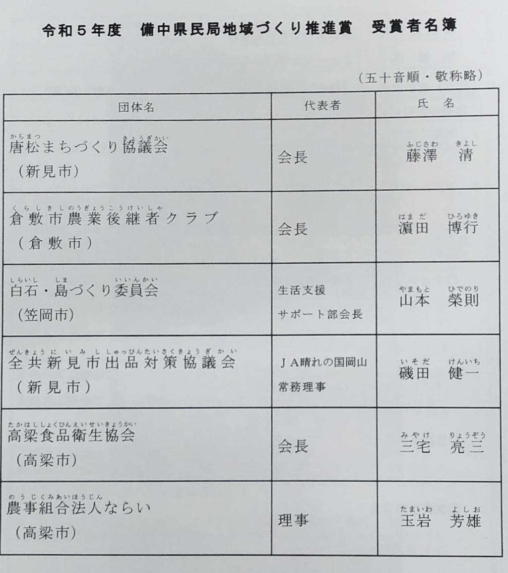 10時から、「備中県民局」で開催された「令和5年度備中県民局地域づくり推進賞表彰式」に出席しました。受賞されました6団体の皆様、誠におめでとうございます。新見市からは、「唐松まちづくり協議会」と「全共新見市出品対策協議会」の2団体が表彰されました。あらためまして、おめでとうございます㊗