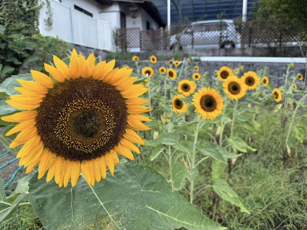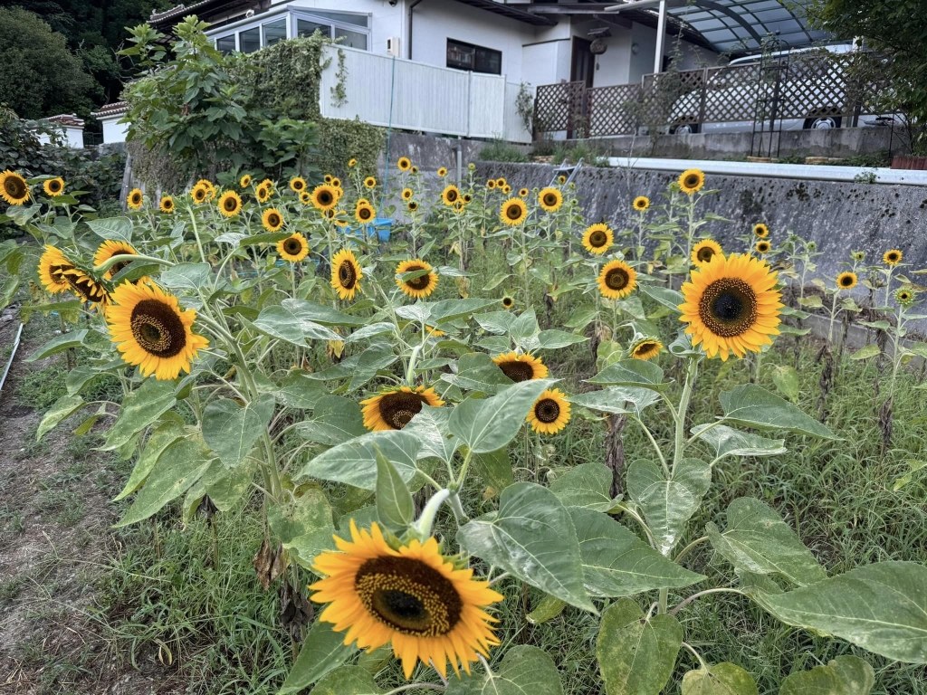 98%は写真の自走式草刈機で。残りの2%のすそ刈りは刈払機で。体力、時間とも節約出来ました。それから、ヒマワリの水やり。これが結構楽しい(#^.^#)