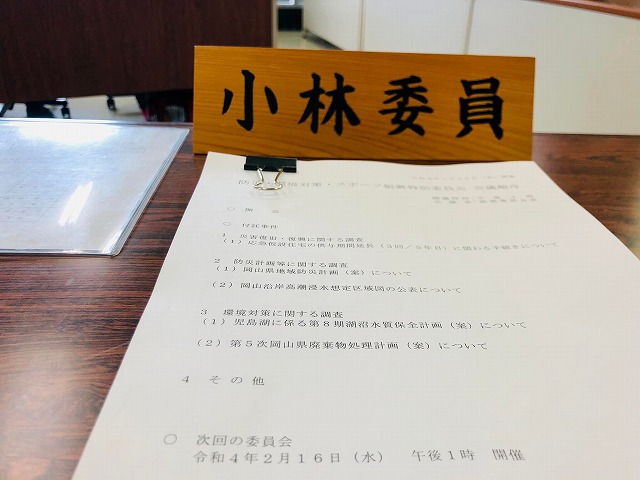 10時から「岡山公証センター」。11時30分から「自民党予算総括協議会」。13時から、県議会「防災・環境対策・スポーツ特別委員会」。その他、「協議」3件。