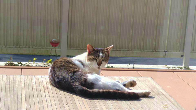 我が家のベランダでなぜかくつろぐノラ猫くん。新見は晴れてたのにね。