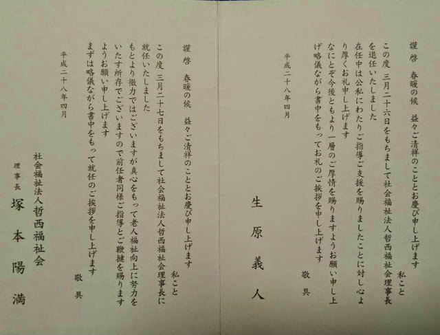 帰宅したら、ご挨拶状が届いていた。ご退任の生原理事長、お疲れさまでした。塚本新理事長、おめでとうございます。