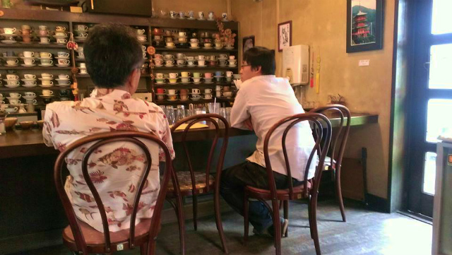 岡山市へ出発する前に、新見市内でコーヒータイム。知り合いの記者さんが、インタビュー中でした。