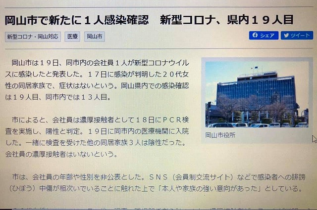 岡山県下、19例目の新型コロナウイルス感染確認。ご注意願います。