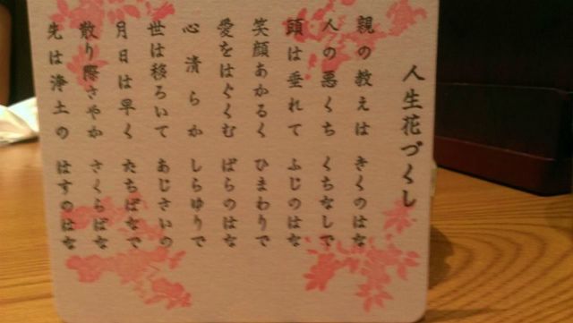 一期生の会の視察研修の後、恒例の懇親会。その店に置いてあったのですが、達者な人はいるもので、「うまいこと言うなぁ」。感心。