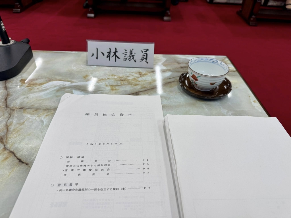 9時から、「協議」2件。9時30分から、『正副議長勉強会』。10時から、『2月定例岡山県議会』再開。「一般質問」3日目。昼休憩時間に開催された『自民党岡山県議団総会』に出席しました。