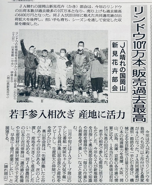 おめでとうございます。新見産リンドウ、出荷本数、売り上げともに過去最高です。「日本農業新聞」から。
