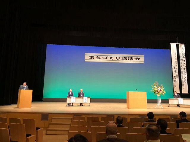 13時30分から「まなび広場にいみ大ホール」で開催された、新見市議会主催の『まちづくり講演会』に出席しました。講師は、早稲田大学公共経営大学院教授の片山善博氏。演題は「人口減少時代のまちづくり~住民参画と議会の役割~」です。ご講演が始まりました。