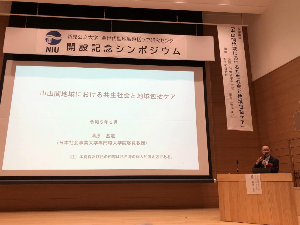 基調講演は、元厚生労働省事務次官の蒲原基道氏。演題は、「中山間地域における共生社会と地域包括ケア」でした。