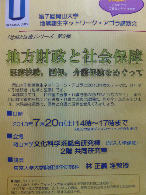 地域医療についてご協力をいただいている岡山大学で、「第7回岡山大学地域創生ネットワーク・アゴラ講演会」が開催されます。「地域と医療」シリーズ第3弾です。新見からの出席をお願いします。