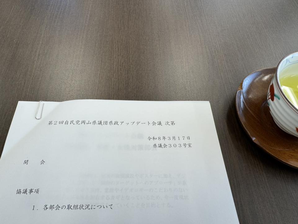 10時から、県議会「総務委員会」に出席。発言させて頂きました。12時ごろから、「自民党岡山県議団県政アップデート会議」に出席しました。